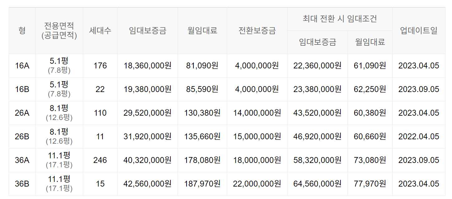 임대보증금 및 월 임대료는 입주자 모집공고일 기준이며, 보증금 최대 전환 시 변동될 수 있습니다.