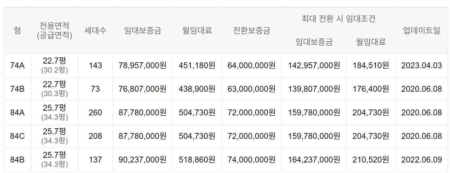 임대보증금 및 월 임대료는 입주자 모집공고일 기준이며, 보증금 최대 전환 시 변동될 수 있습니다.