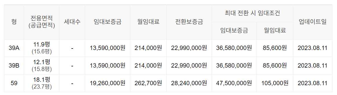 임대보증금 및 월 임대료는 입주자 모집공고일 기준이며, 보증금 최대 전환 시 변동될 수 있습니다.