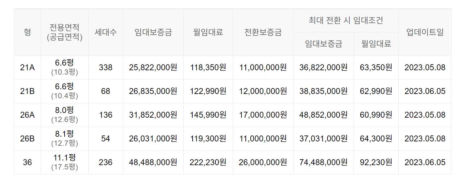 임대보증금 및 월 임대료는 입주자 모집공고일 기준이며, 보증금 최대 전환 시 변동될 수 있습니다.