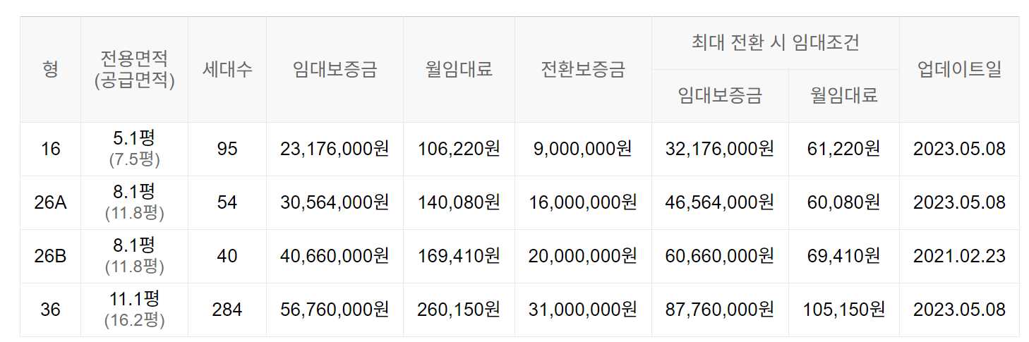 임대보증금 및 월 임대료는 입주자 모집공고일 기준이며, 보증금 최대 전환 시 변동될 수 있습니다.
