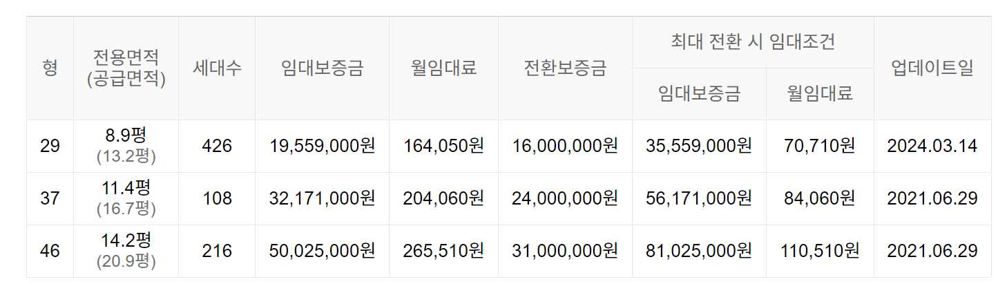 임대보증금 및 월 임대료는 입주자 모집공고일 기준이며, 보증금 최대 전환 시 변동될 수 있습니다.