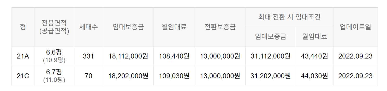 임대보증금 및 월 임대료는 입주자 모집공고일 기준이며, 보증금 최대 전환 시 변동될 수 있습니다.
