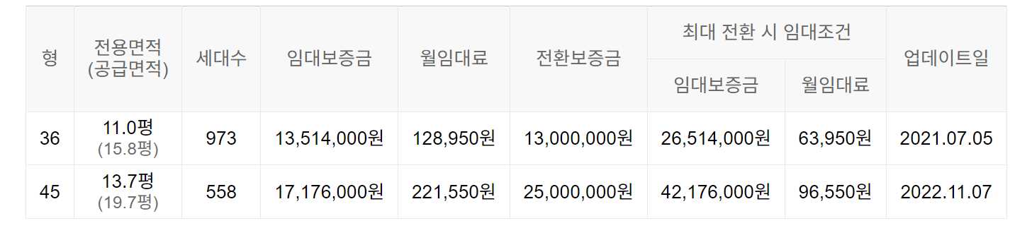 임대보증금 및 월 임대료는 입주자 모집공고일 기준이며, 보증금 최대 전환 시 변동될 수 있습니다.