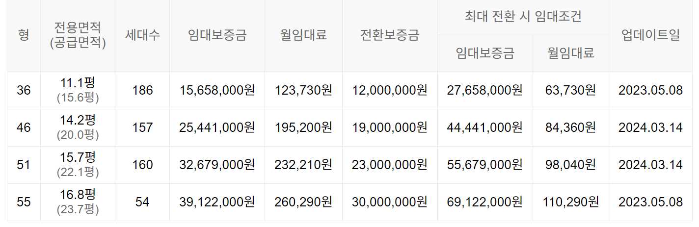 임대보증금 및 월 임대료는 입주자 모집공고일 기준이며, 보증금 최대 전환 시 변동될 수 있습니다.
