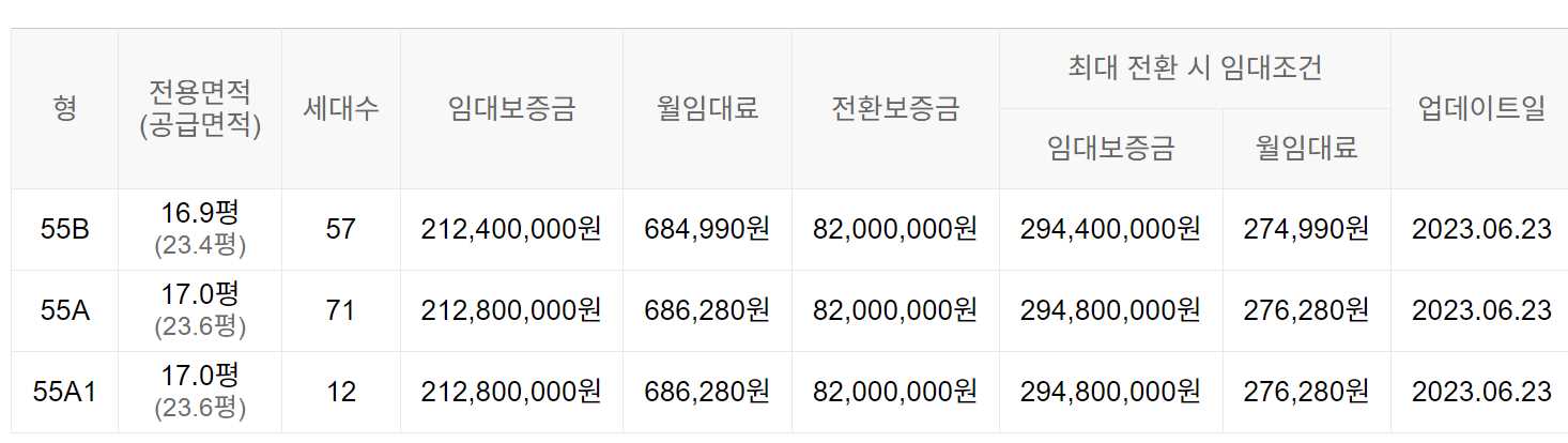 임대보증금 및 월 임대료는 입주자 모집공고일 기준이며, 보증금 최대 전환 시 변동될 수 있습니다.