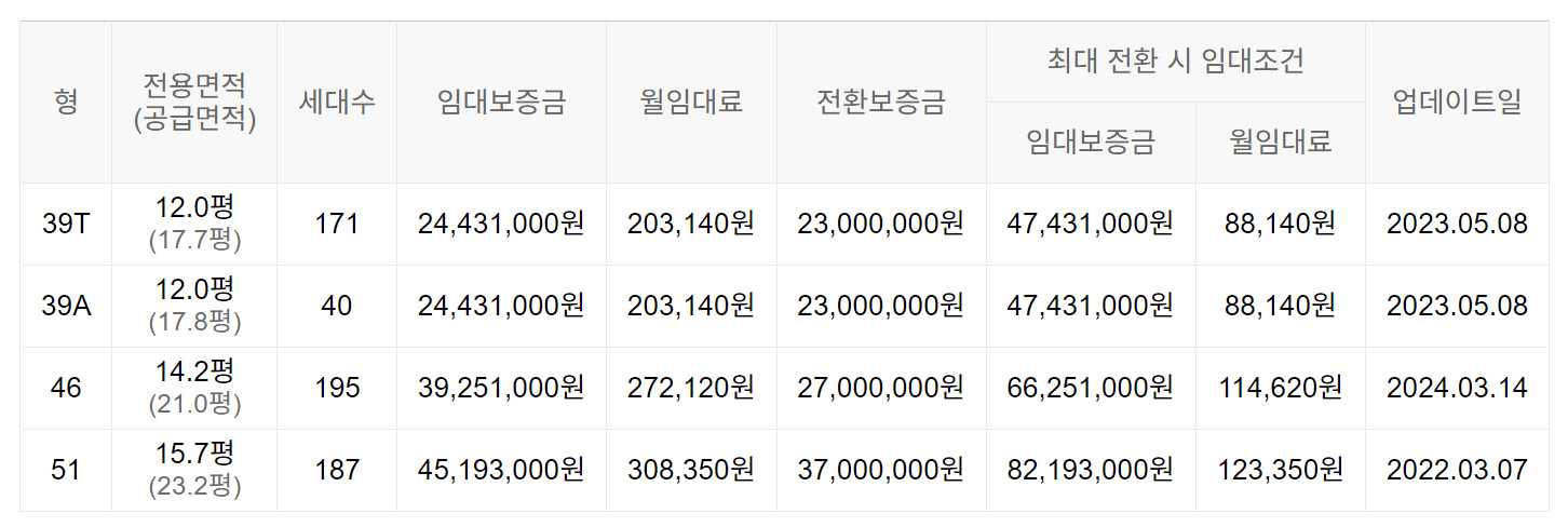 임대보증금 및 월 임대료는 입주자 모집공고일 기준이며, 보증금 최대 전환 시 변동될 수 있습니다.