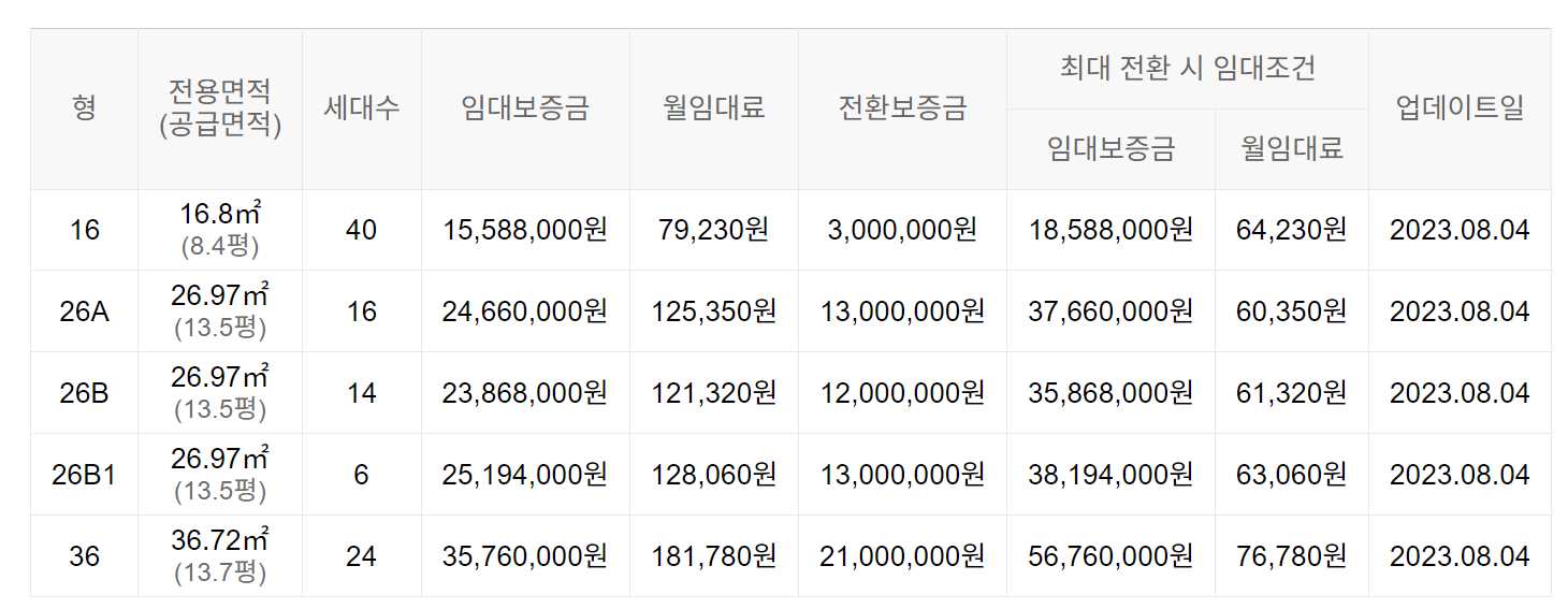 임대보증금 및 월 임대료는 입주자 모집공고일 기준이며, 보증금 최대 전환 시 변동될 수 있습니다.