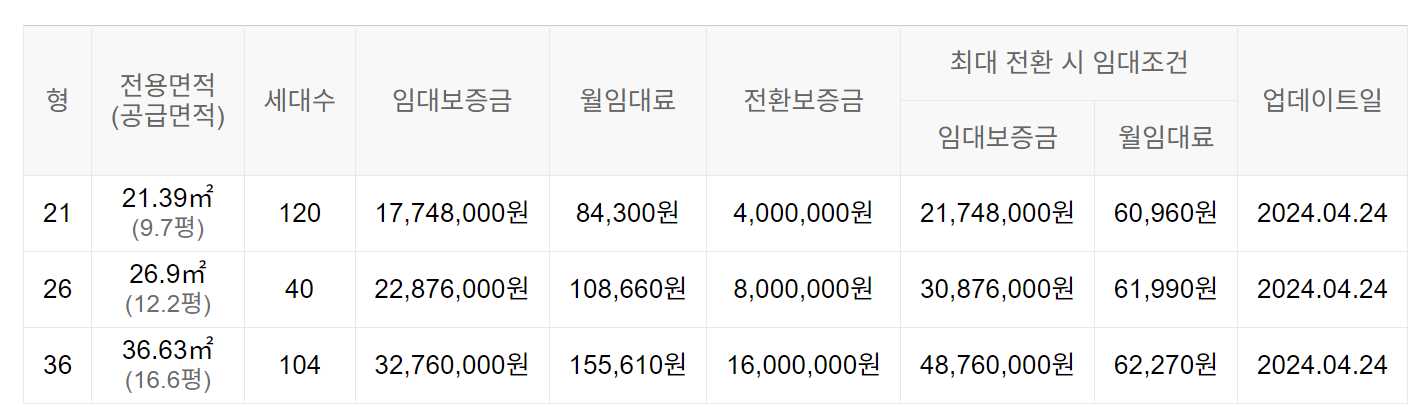 임대보증금 및 월 임대료는 입주자 모집공고일 기준이며, 보증금 최대 전환 시 변동될 수 있습니다.