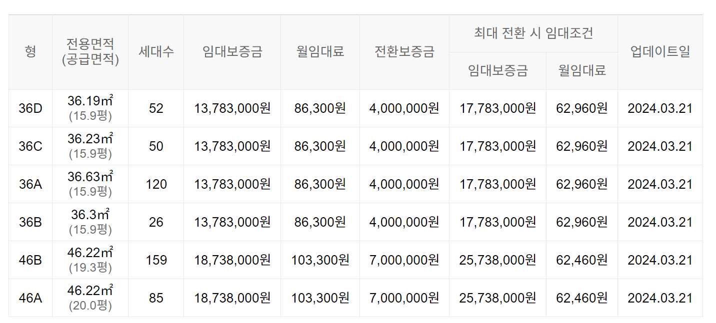 임대보증금 및 월 임대료는 입주자 모집공고일 기준이며, 보증금 최대 전환 시 변동될 수 있습니다.