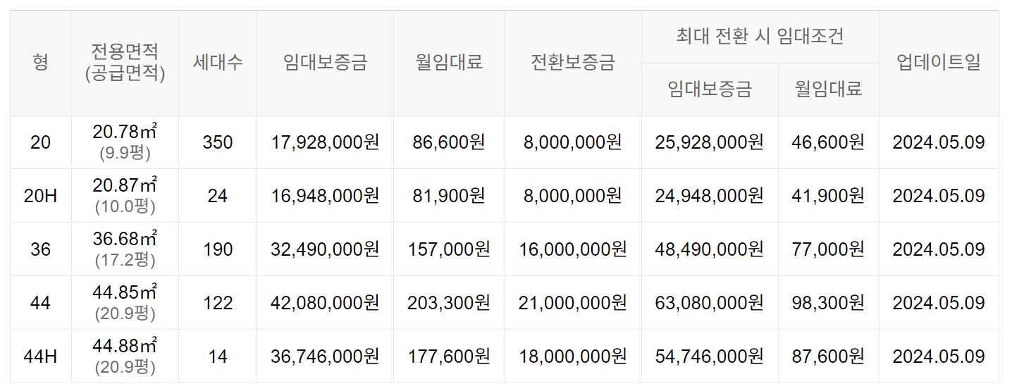 임대보증금 및 월 임대료는 입주자 모집공고일 기준이며, 보증금 최대 전환 시 변동될 수 있습니다.