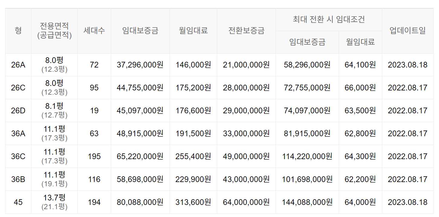 임대보증금 및 월 임대료는 입주자 모집공고일 기준이며, 보증금 최대 전환 시 변동될 수 있습니다.