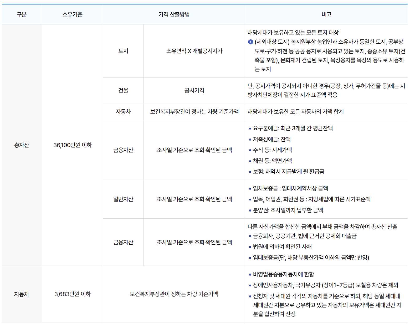 - 총 자산 보유기준 36,100만원 이하 (보유 부동산, 금융자산, 기타자산, 자동차가액을 합산한 금액에서 부채를 차감한 금액)