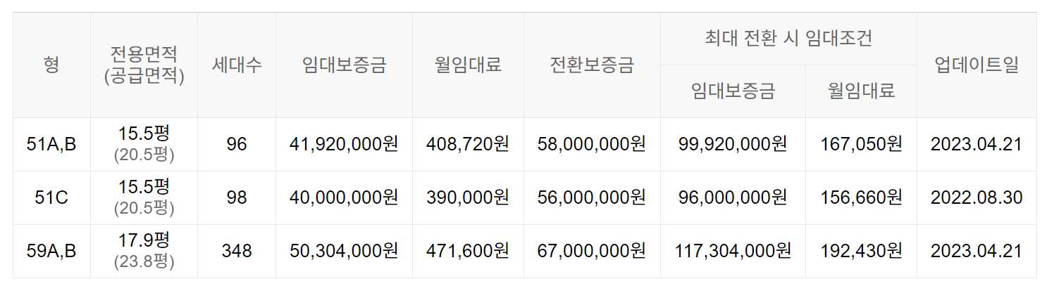 임대보증금 및 월 임대료는 입주자 모집공고일 기준이며, 보증금 최대 전환 시 변동될 수 있습니다.