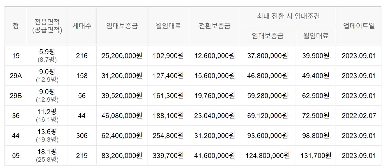 임대보증금 및 월 임대료는 입주자 모집공고일 기준이며, 보증금 최대 전환 시 변동될 수 있습니다.