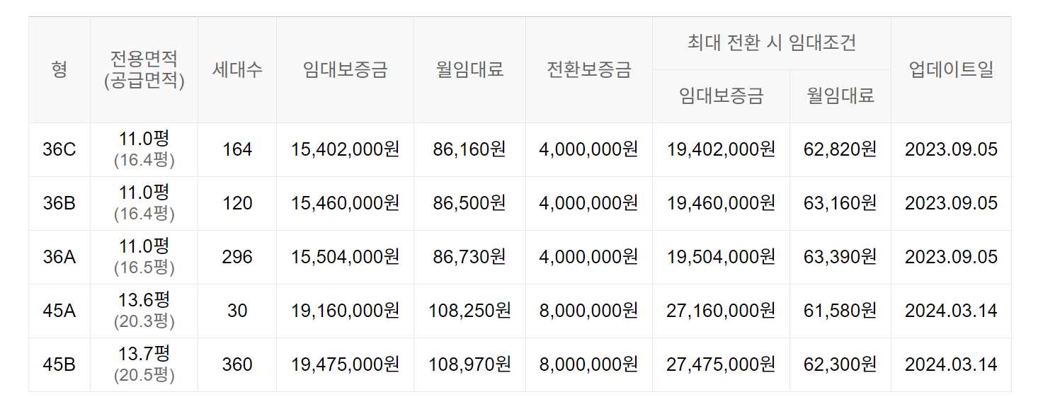 임대보증금 및 월 임대료는 입주자 모집공고일 기준이며, 보증금 최대 전환 시 변동될 수 있습니다.