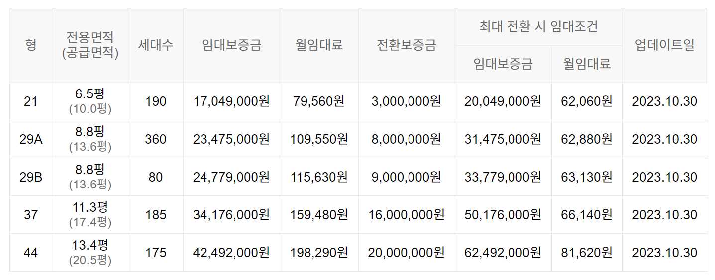 임대보증금 및 월 임대료는 입주자 모집공고일 기준이며, 보증금 최대 전환 시 변동될 수 있습니다.