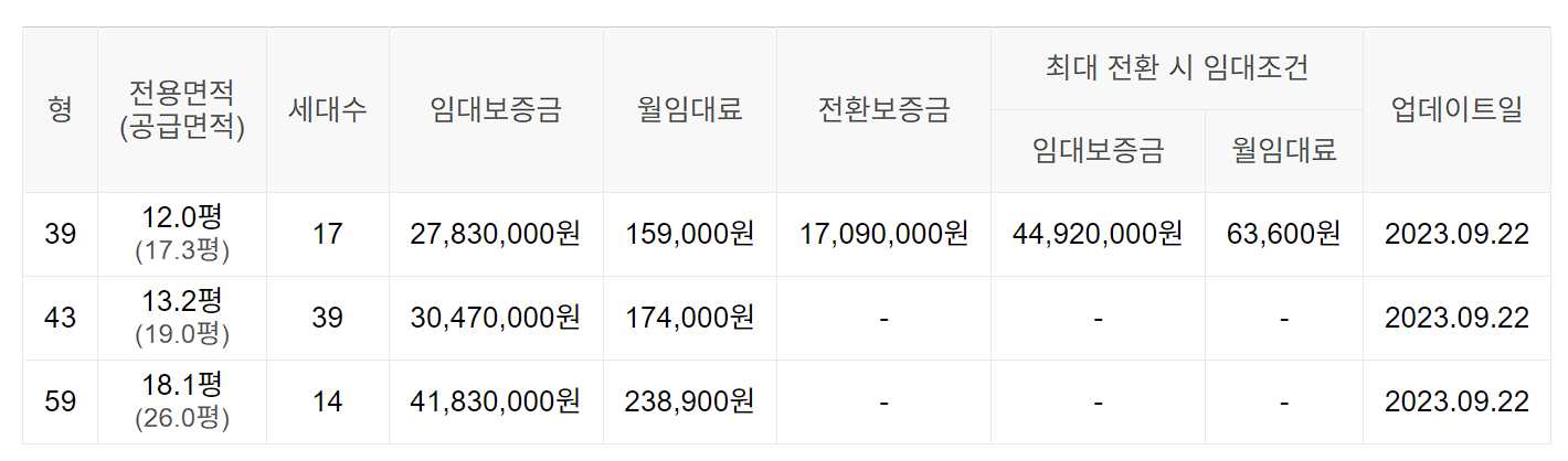 임대보증금 및 월 임대료는 입주자 모집공고일 기준이며, 보증금 최대 전환 시 변동될 수 있습니다.