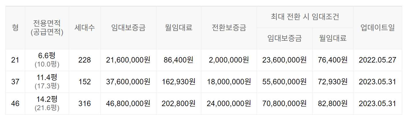 임대보증금 및 월 임대료는 입주자 모집공고일 기준이며, 보증금 최대 전환 시 변동될 수 있습니다.