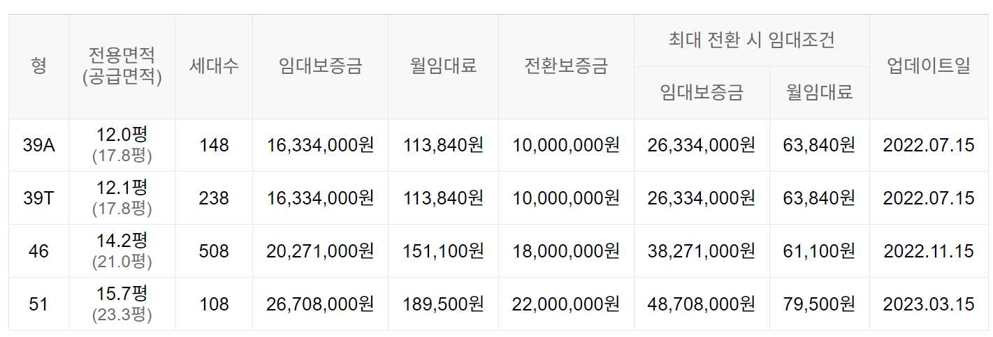 임대보증금 및 월 임대료는 입주자 모집공고일 기준이며, 보증금 최대 전환 시 변동될 수 있습니다.