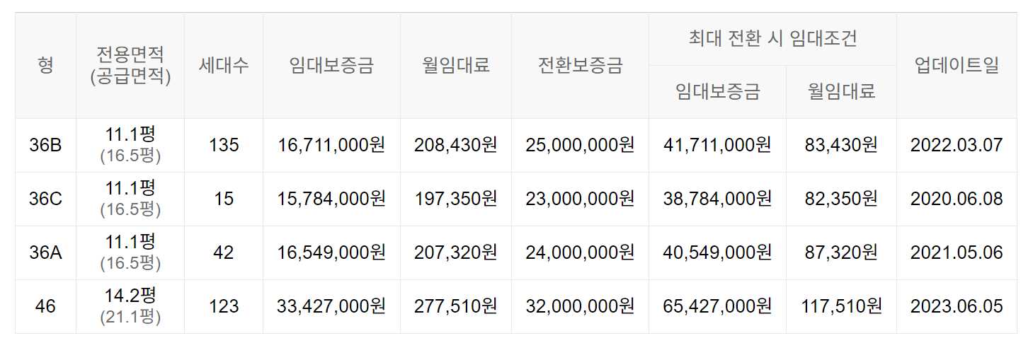 임대보증금 및 월 임대료는 입주자 모집공고일 기준이며, 보증금 최대 전환 시 변동될 수 있습니다.