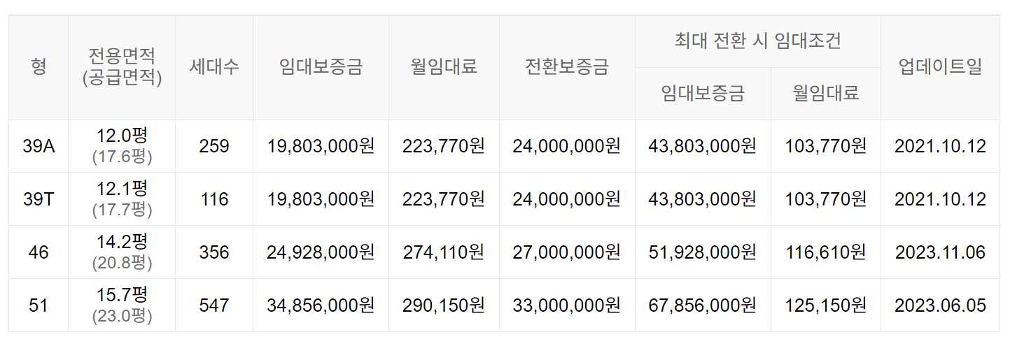 임대보증금 및 월 임대료는 입주자 모집공고일 기준이며, 보증금 최대 전환 시 변동될 수 있습니다.