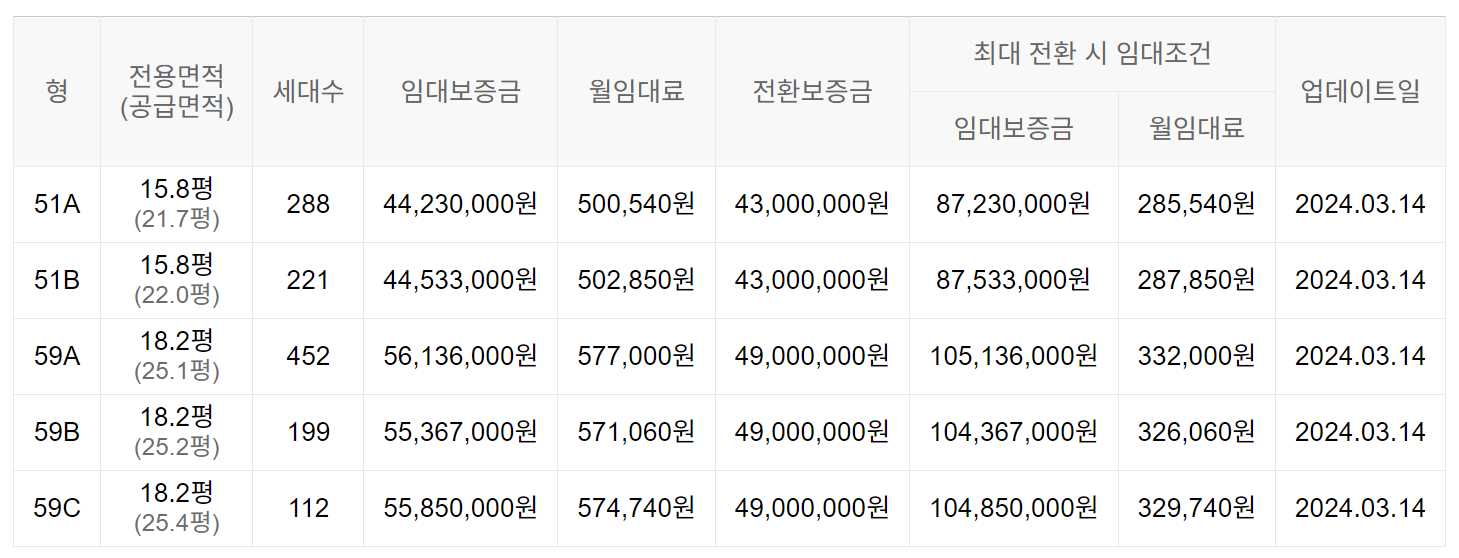 임대보증금 및 월 임대료는 입주자 모집공고일 기준이며, 보증금 최대 전환 시 변동될 수 있습니다.