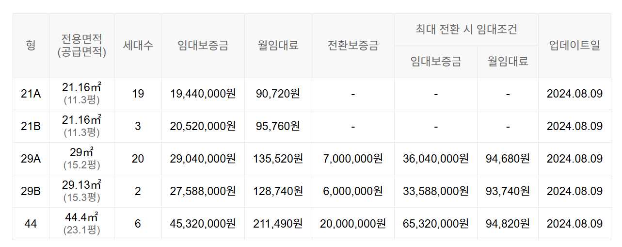 임대보증금 및 월 임대료는 입주자 모집공고일 기준이며, 보증금 최대 전환 시 변동될 수 있습니다.