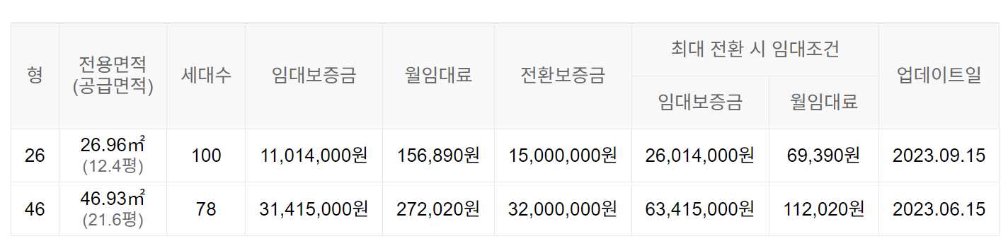 임대보증금 및 월 임대료는 입주자 모집공고일 기준이며, 보증금 최대 전환 시 변동될 수 있습니다.