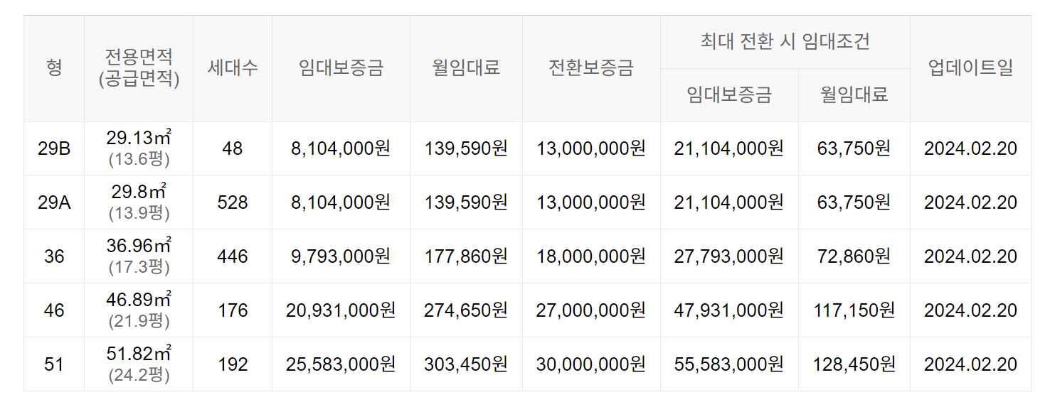 임대보증금 및 월 임대료는 입주자 모집공고일 기준이며, 보증금 최대 전환 시 변동될 수 있습니다.