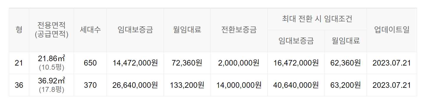 임대보증금 및 월 임대료는 입주자 모집공고일 기준이며, 보증금 최대 전환 시 변동될 수 있습니다.