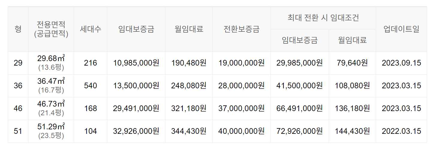 임대보증금 및 월 임대료는 입주자 모집공고일 기준이며, 보증금 최대 전환 시 변동될 수 있습니다.