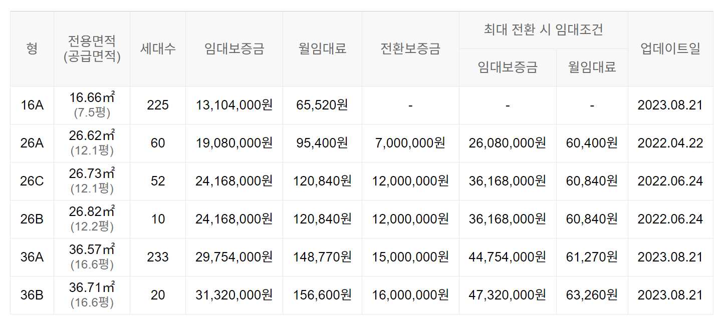 임대보증금 및 월 임대료는 입주자 모집공고일 기준이며, 보증금 최대 전환 시 변동될 수 있습니다.