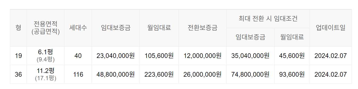 임대보증금 및 월 임대료는 입주자 모집공고일 기준이며, 보증금 최대 전환 시 변동될 수 있습니다.