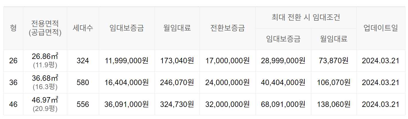 임대보증금 및 월 임대료는 입주자 모집공고일 기준이며, 보증금 최대 전환 시 변동될 수 있습니다.