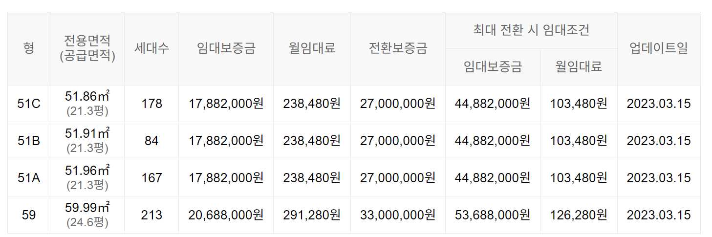 임대보증금 및 월 임대료는 입주자 모집공고일 기준이며, 보증금 최대 전환 시 변동될 수 있습니다.