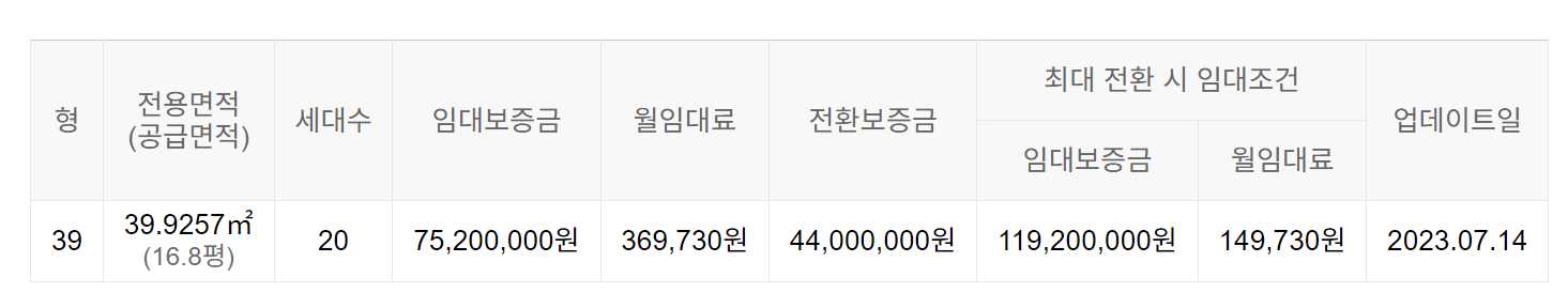 임대보증금 및 월 임대료는 입주자 모집공고일 기준이며, 보증금 최대 전환 시 변동될 수 있습니다.