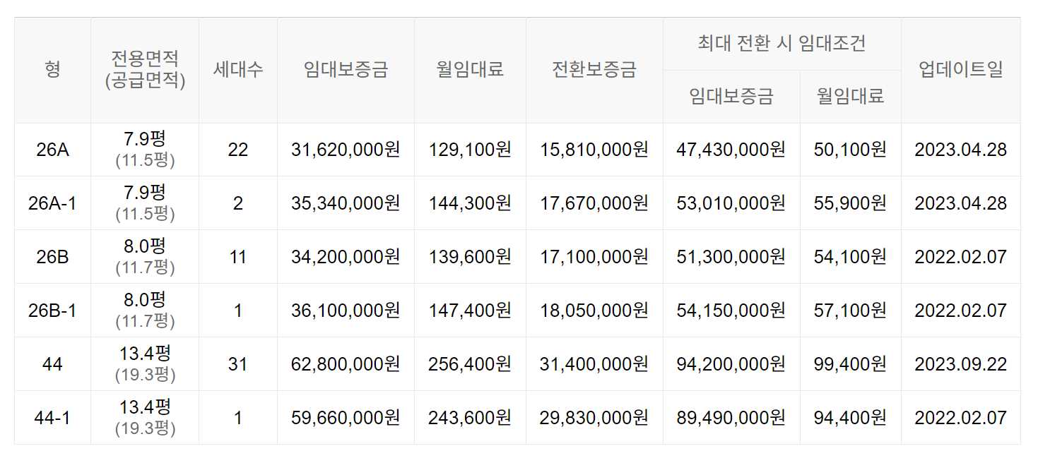 임대보증금 및 월 임대료는 입주자 모집공고일 기준이며, 보증금 최대 전환 시 변동될 수 있습니다.