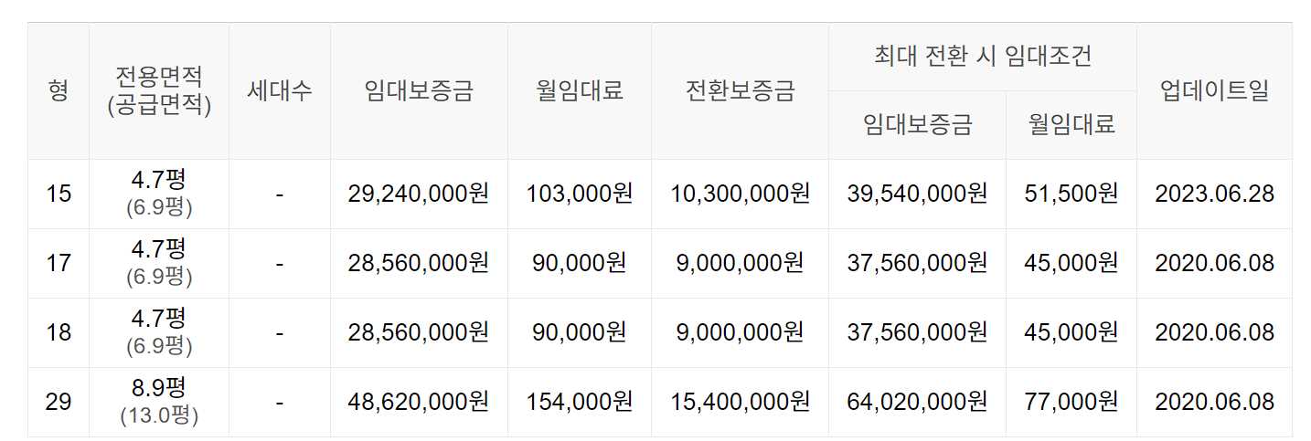 임대보증금 및 월 임대료는 입주자 모집공고일 기준이며, 보증금 최대 전환 시 변동될 수 있습니다.
