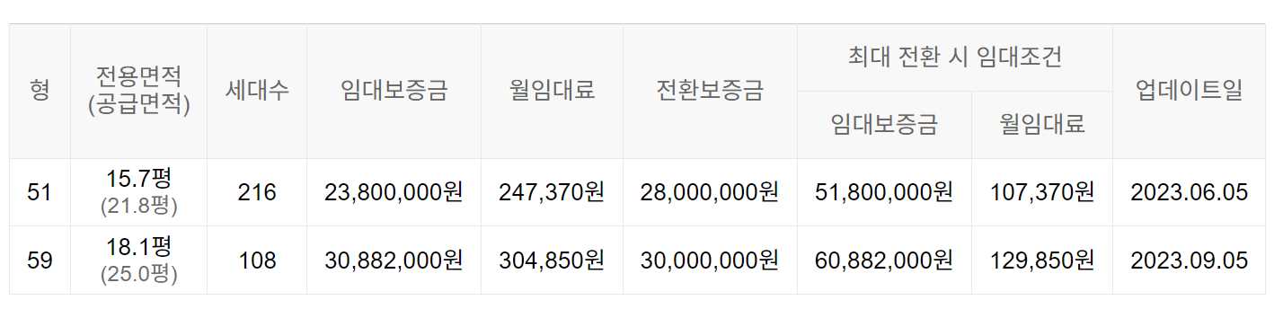 임대보증금 및 월 임대료는 입주자 모집공고일 기준이며, 보증금 최대 전환 시 변동될 수 있습니다.