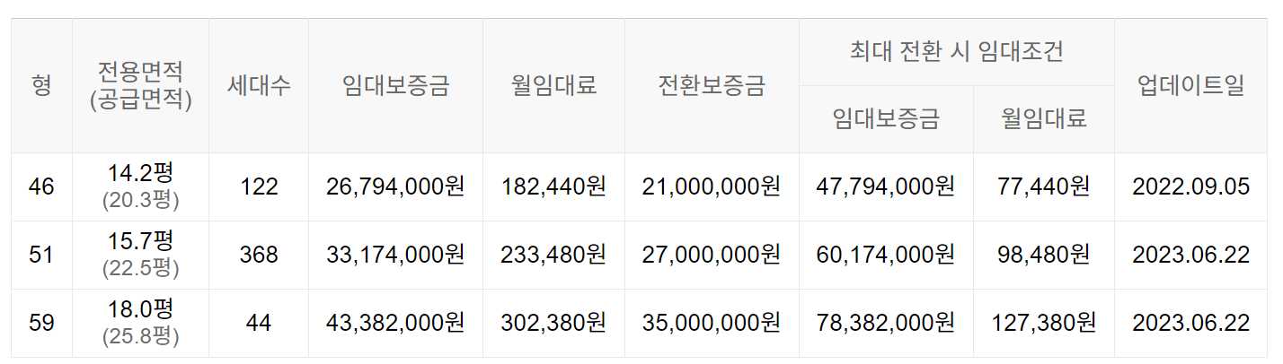 임대보증금 및 월 임대료는 입주자 모집공고일 기준이며, 보증금 최대 전환 시 변동될 수 있습니다.