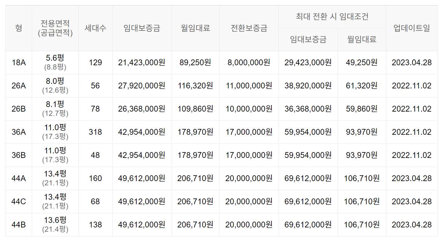 임대보증금 및 월 임대료는 입주자 모집공고일 기준이며, 보증금 최대 전환 시 변동될 수 있습니다.