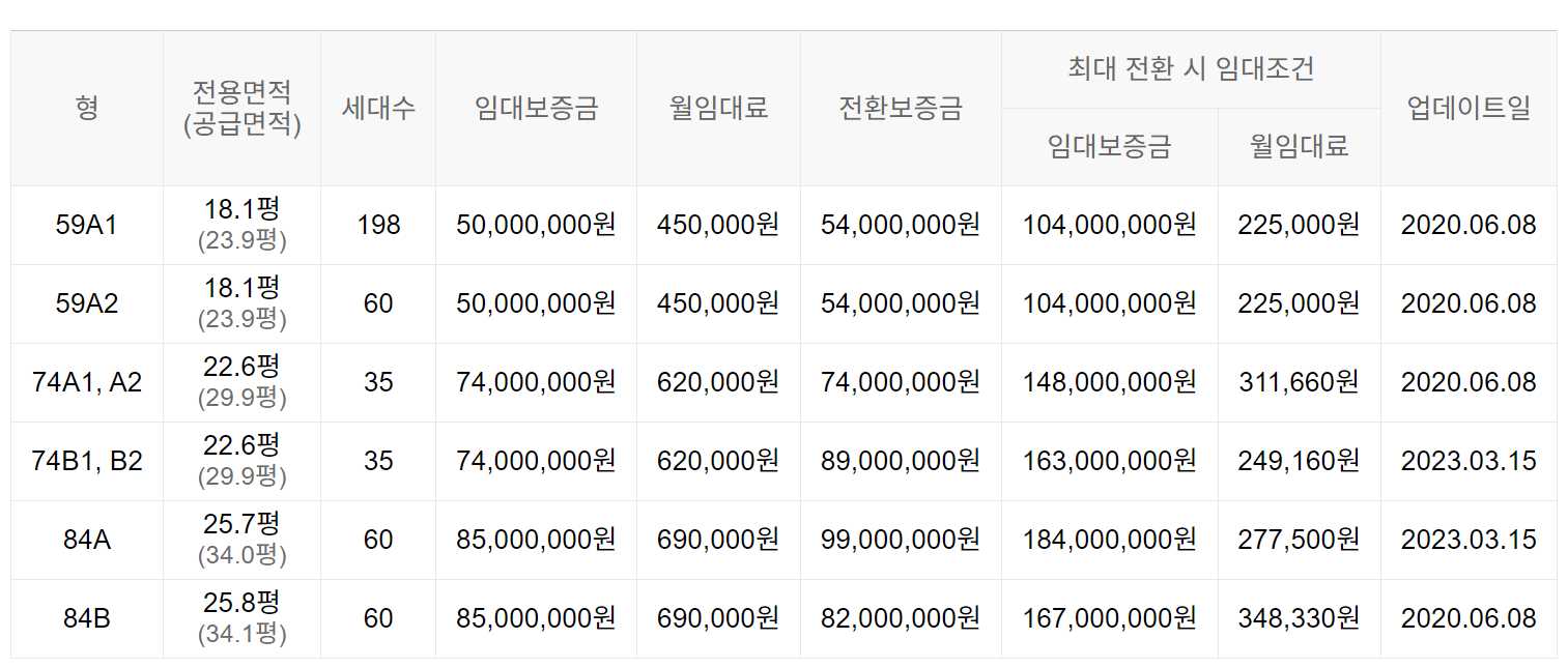 임대보증금 및 월 임대료는 입주자 모집공고일 기준이며, 보증금 최대 전환 시 변동될 수 있습니다.