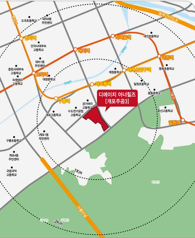 디에이치아너힐즈은 서울 강남구 구룡역, 개포동역 근처에 위치하고 있습니다.