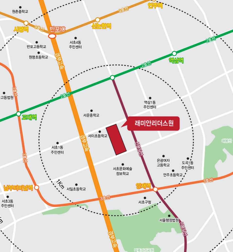 래미안리더스원은 서울 서초구 강남역, 양재역 근처에 위치하고 있습니다.