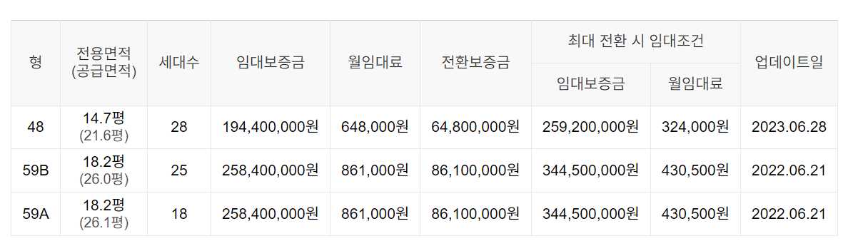 임대보증금 및 월 임대료는 입주자 모집공고일 기준이며, 보증금 최대 전환 시 변동될 수 있습니다.