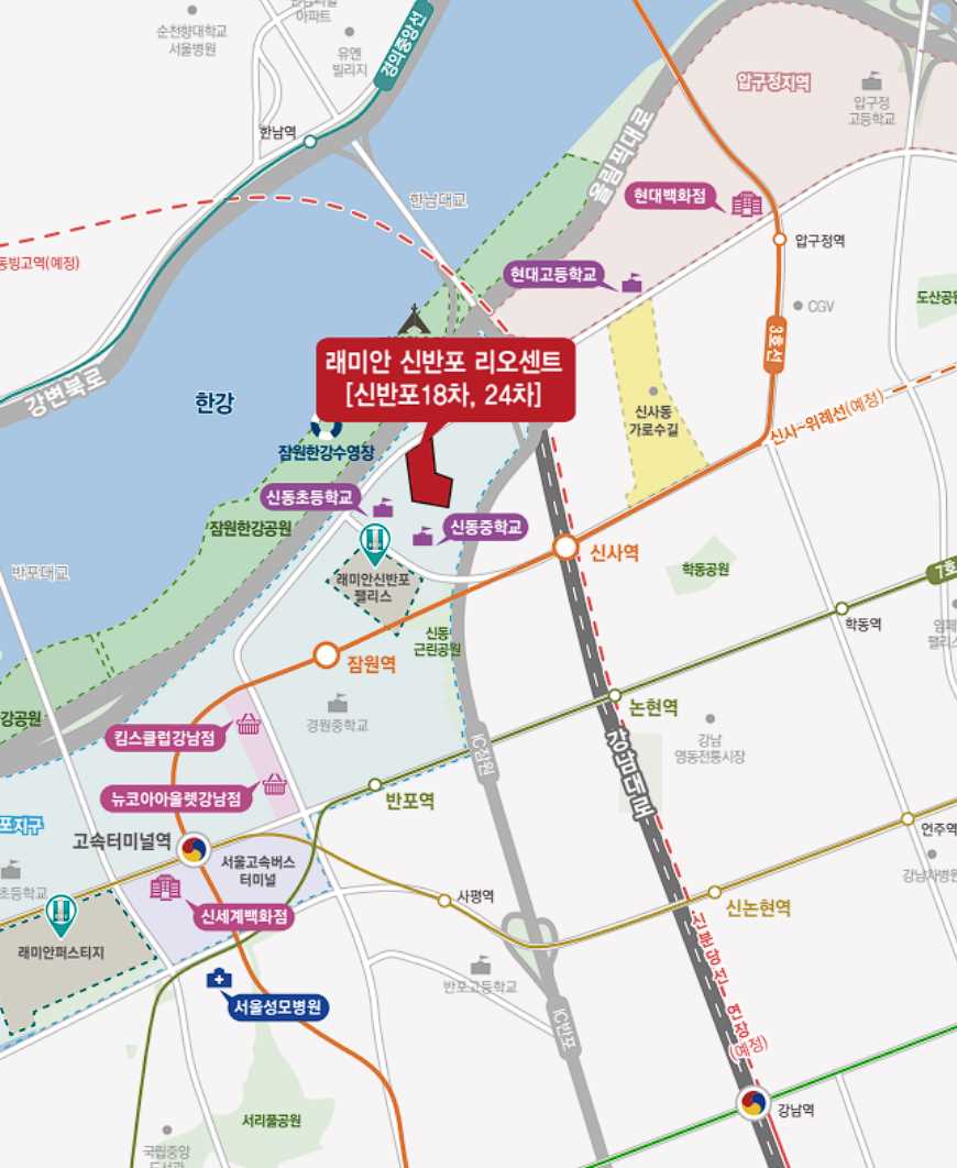 래미안신반포리오센트은 서울 서초구 잠원역, 신사역, 잠원한강공원 근처에 위치하고 있습니다.