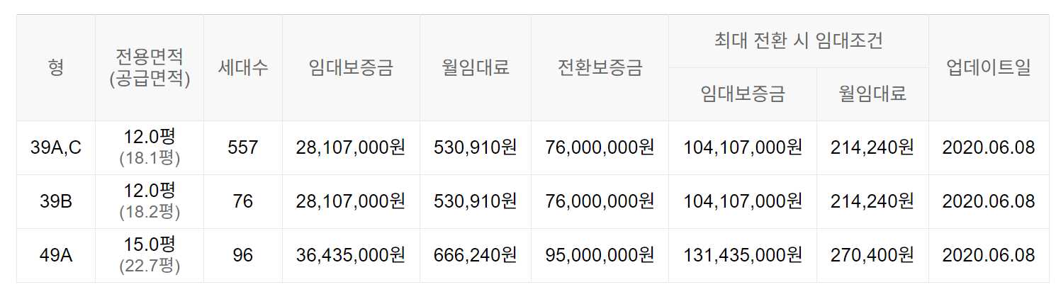 임대보증금 및 월 임대료는 입주자 모집공고일 기준이며, 보증금 최대 전환 시 변동될 수 있습니다.