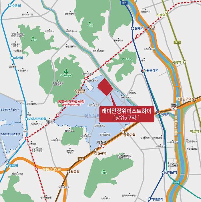 래미안장위퍼스트하이는 서울 성북구 돌곶이역, 광운대역 근처에 위치하고 있습니다.