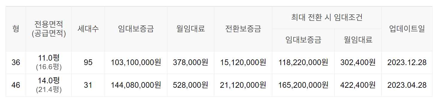 임대보증금 및 월 임대료는 입주자 모집공고일 기준이며, 보증금 최대 전환 시 변동될 수 있습니다.
